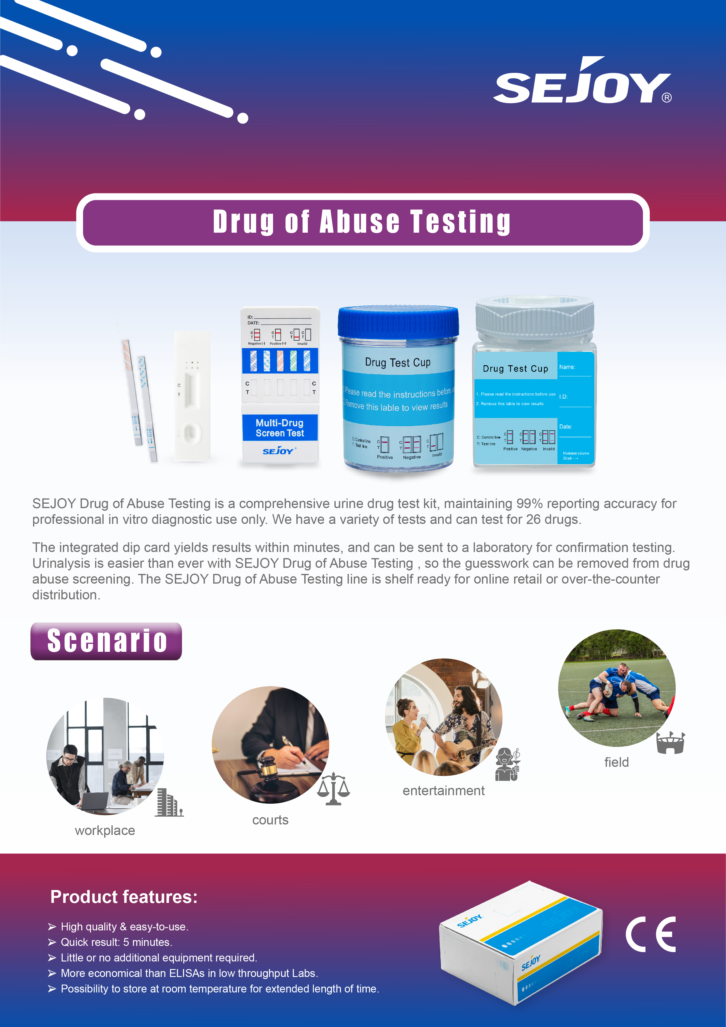 Testing for drugs of abuse usually involves testing a urine specimen for a number of drugs. It should be noted, however, that a single urine drug test detects only fairly recent drug use and does not differentiate casual use from chronic drug use. The latter requires sequential drug testing and clinically evaluation. Also, urine testing does not determine the degree of impairment, the dose of drug taken or the exact time of use.